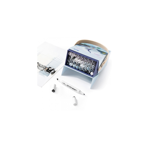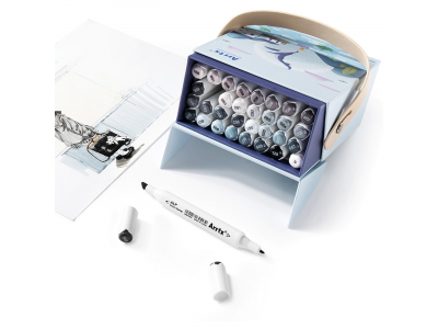 High-brightness and high-quality professional markers-felt-tip pens ARRTX Alp, designed for drawing, illustration, sketching, highlighting, rendering. The set includes 32 shades of gray. This set of markers comes with a box with a stylish design. The box is designed so that each marker has a separate compartment, and when the box is opened, its lid can be used as a stand. The built-in strap at the top of the box makes it easy to carry the marker in a convenient place for you. An empty box can be used as a storage box.