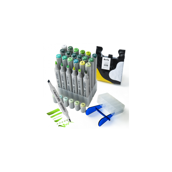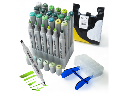 Professional art markers: All Arrtx OROS series markers use durable fiber tips, highly pigmented high-quality alcohol-based inks. We aim to provide quality markers for artists, designers, artists, craftsmen, art students, and more. Markers ARRTX Oros for drawing, illustration, sketching, developing, rendering. The set includes 24 shades of green. This set of markers comes with a woven bag, and the pens are placed in a paste holder. The holder is designed so that each marker has a separate compartment.