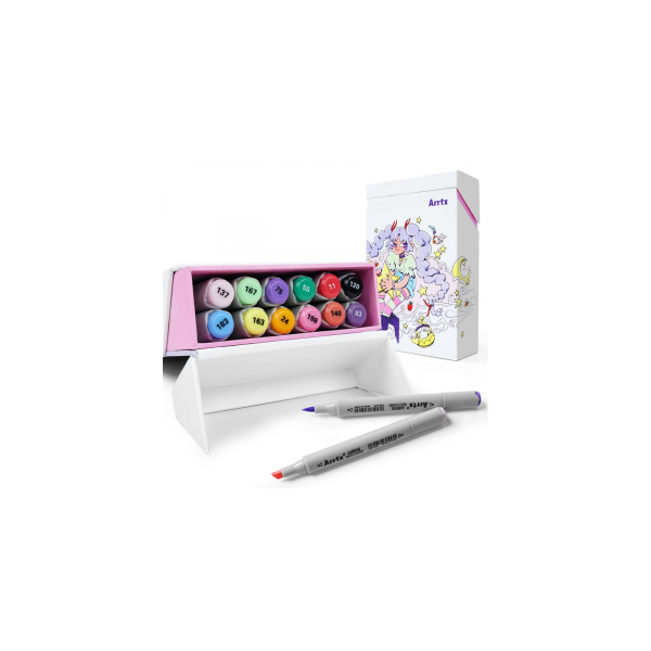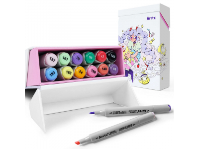 High-brightness and high-quality professional markers-felt-tip pens ARRTX Oros for drawing, illustration, sketching, sharpening, rendering. The set includes 12 pastel shades. This set of markers comes with a box with a stylish design. The box is designed so that each marker has a separate compartment, and when the box is opened, its lid can be used as a stand. An empty box can be used as a storage box.