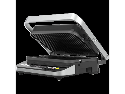 Features | Intuitive touch control E-recipe book 3-in-1: grill, barbecue and oven Powerfull - 2000 W Precise manual settings: up to 230 °C in 5 °C increments; up to 60 minutes timer Enlarged coking space: 6 portions at the same time Cook at 2 plates at the same time: 180° opening angle Double-sided plates: choose the preferable ones - ribbed or flat Convinient LED display Auto power-off: overheat protection 5 minutes for ideal medium-rare steak Anti-slip feet keeps grill firmly in place Color and sound indication Oil drip tray: less mess while cooking Removable non-stick plates: easy-to-clean under the tap or in dishwasher Fast pre-heating: ready to use in 2 minutes Safe-to-touch: non-heated handle and top surface Included: 2 double sided plates, oil drip tray Compatible accessories always available: waffle plates, double-sided plates 320*220mm plate size Cook healthy food with no oil: non-stick plates 6 preset cooking programs: Beef, Fish, Chicken, Sausage, Humburg, Bacon 2 cooking modes: lower grill or both grills Defrost function Easy-to-clean control panel |