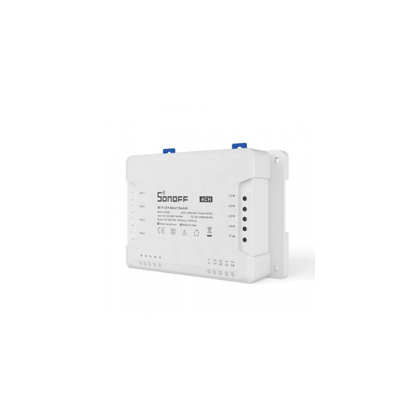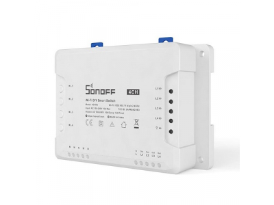 Specifications: Voltage: AC 100~240V, DC 9~23V.Current max: 10A (1 channel), 40A (4 channels).Power: 2200W (1 channel), 8800W (4 channels).Frequency: 50-60Hz.Wi-Fi frequency: 2.4 GHz.Wi-Fi standard: IEEE802.11b/g/n.Number of channels: 4.Works with Amazon Alexa & Google Assistant.Security: WPA/WPA2.App: eWeLink (Android, iOS).Dimensions: 145x90x34mm.Housing material: PC V0 (non-combustible).Operating temperature: -10°C~40°C.Humidity: 5%-95%.Weight: 374 g.Colour: white.Certification: CE/ FCC/ RoHS.