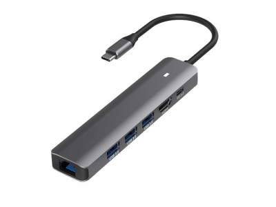 Adapter USB Type-C to HDMI, LAN, 3x USB 3.0 Type-A, USB Type-C PD100WFeatures: The 6-in-one adapter has docking station function for notebooks, allows you to connect a keyboard, mouse, speaker, hard disk or Flash drive, Gigabit Ethernet cable.Supports fast charging PD 3.0 standard 100W.The HDMI connector allows you to transfer video and audio from your phone or computer to your TV or projector with 4K resolution.The USB 3.0 ports supports 5Gb/s data transfer rates.The adapter is compatible with Windows, Mac OS and Linux operating systems.Aluminium housing, fast heat dissipation. LED working indicator.