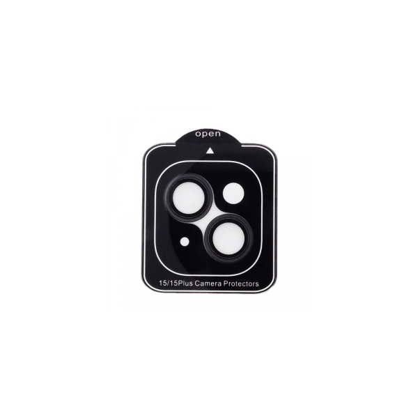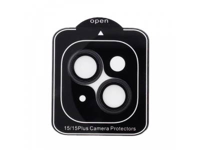 Lens shield with black frames for Apple iPhone 15 / 15 Plus camera lenses. This protective glass is made from tempered glass and reaches 9H according to Mohs. Lens shield is designed to protect phone cameras from mechanical damage, such as bruises or scratches left by sharp objects. Protective glass with metal frames fully cover the camera lens.