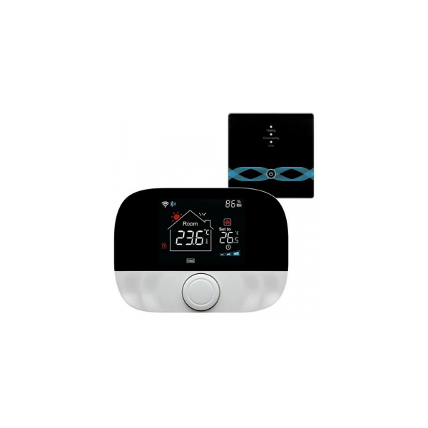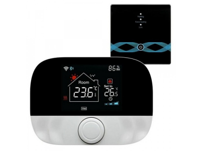 Smart thermostat for gas boiler heating, 3A, Wi-Fi, RF, Tuya, Smart LifeFeatures:Remote control thermostat for gas heating boiler, programmable. Designed to automatically adjust the room temperature by switching the boiler on and off remotely. Various control modes are supported.The device consists of two parts: a transmitter and a receiver, and operates by 433 MHz radio communication. The receiver is connected to the controlled device (boiler) and the thermostat (transmitter) can be mounted on the wall or placed on a table surface.The thermostat can be controlled by voice via Amazon Alexa or Google Assistant connected to your home system.With the Tuya Smart/ Smart Life mobile app (iOS and Android), you can adjust the temperature even when you are not at home.The unit has child lock function and anti-freeze protection.Outdoor weather synchronisation via Wi-Fi is supported.There are supported 3 selectable automatic programming modes: 5+2/ 6+1/ 7 days. The thermostat allows you to set up to 5 temperature values per day.The transmitter supports two power supply modes: 2x AA batteries (not included) or USB powered with the included USB Type-C cable (USB wall charger is purchased separately).The clear black display with colour indicators is not only informative but also stylish. The rotary knob is designed for more convenient temperature setting.The thermostat and the receiver are already paired at the factory to ensure a stable and fast signal, and they are ready to be used.