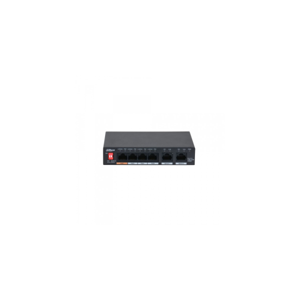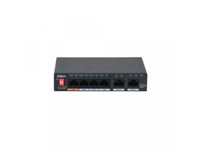 Product Overview DH-PFS3006-4GT-60 is an unmanaged Desktop Switch with 4 × 10/100/1000 Mbps PoE Ports. It provides 4 × 10/100/1000 Mbps Ethernet ports and 2 × 10/100/1000 Mbps uplink ports. The product is equipped with two types of transmission modes (Extend Mode On/ Extend Mode Off). It also supports PoE watchdog to avoid manually maintenance and device restart, which can realize the intelligent management and reduce the cost. The device is applicable for use in different scenarios, including home, office, server farm, and small mall. Features: • Intelligent PoE controls over power consumption and offers real-time monitoring. Supports ultra wide power supplies and is able to adapt to IPC power fluctuations. • Supports long distance PoE transmission. By dialing or enabling long-range transmission on the WEB interface, the transmission distance of a PoE port can be up to 250 m, meeting the requirements of wired transmission (bandwidth reduced to 10Mbps). • All-gigabit ports provide real-time transmisstion with no lag. • The orange port meets the IEEE 802.3af and IEEE 802.3at Hi-PoE standards, also supports a maximum power output of 60W for powering high-power devices. • Innovative PoE Watchdog can be switched on by dialing or turning on the WEB page switch. • MAC address list capacity is 2K. • Conform IEEE802.3, IEEE802.3u, IEEE802.3ab, IEEE802.3x standards. • Support PoE IEEE802.3af/ IEEE802.3at/ Hi-PoE standard. • Industrial wide temperature design. Technical Specifications: • Model PFS3210-8GT2GF-96. Ethernet Ports: • 4*10/100/1000Mbps RJ45 (PoE). • 2*10/100/1000Mbps RJ45 (uplink). • PoE Power Consumption Port 1=60W (Hi-PoE), Port 2-4=30W, Total=60W. • PoE Protocol IEEE802.3af/ IEEE802.3at/ Hi-PoE. • PoE/Hi-PoE PIN Assignment: 1, 2, 4, 5 (V+), 3, 6, 7, 8 (V-). • Switching Capacity 14Gbps. • Packet Forwarding 8.928 Mbps. • Packet Buffer Memory 1Mbit. • MAC Table Size 2K. • Application Humidity 5%~95%RH. • Power input: DC 48V-57V. • Lighting Protection Common Mode 4KV. • Differential Mode 2KV. • ESD protection Air discharge: 8 kV. • Contact discharge: 6 kV. • Weight: 300 g. • Working Temperature: -10°C~55°C. • Dimension(W×D×H) 130mm×85mm×26mm. Transmission Performance: Switch power supply voltage 53V. CAT5E/CAT6. Max. DC resistance < 10ohm/100m Cable(m) - Load Capacity(W) - Bandwidth(Mbps) IEEE802.3bt 90W: 100m Cable; 71.3W Load Capacity; 100Mbps Bandwidth. 150m Cable; 62W Load Capacity; 10Mbps Bandwidth. 200m Cable; 51W Load Capacity; 10Mbps Bandwidth. 250m Cable; 40W Load Capacity; 10Mbps Bandwidth. Hi-PoE 60W: 100m Cable; 53W Load Capacity; 100Mbps Bandwidth. 150m Cable; 50W Load Capacity; 10Mbps Bandwidth. 200m Cable; 47W Load Capacity; 10Mbps Bandwidth. 250m Cable; 37W Load Capacity; 10Mbps Bandwidth. IEEE802.3at 30W: 100m Cable; 25.5W Load Capacity; 100Mbps Bandwidth. 150m Cable; 25.5W Load Capacity; 10Mbps Bandwidth. 200m Cable; 25.5W Load Capacity; 10Mbps Bandwidth. 250m Cable; 25.5W Load Capacity; 10Mbps Bandwidth. Note: The actual transmission distance may vary due to power consumption of connected devices or the cable type and status.