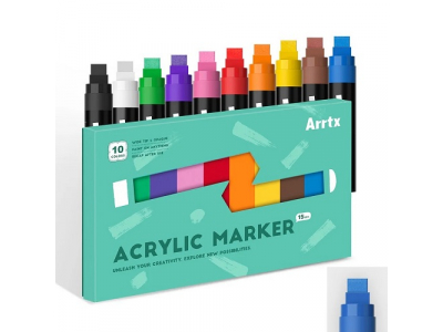 High-quality ARRTX waterproof acrylic paint marker pens set is designed for painting on different surfaces, such as cardboard, fabric, metal, glass, ceramics, plastic, wood, stone and more. The set includes 10 markers: 8 universal vibrant colors, 1 black and 1 white. Felt tip 15mm enables to cover large areas. The markers are safe, odourless, acid-free and water-based.