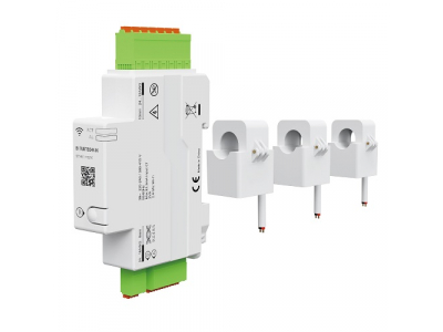 The smart energy monitoring device consists of one monitor installed on DIN rail and three split-core current transformers (CTs).