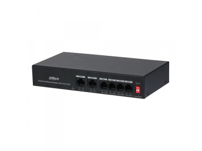 6-Port Fast Ethernet Switch with 4-Port PoE Product Overview The PFS3006-4ET-36 4-Port PoE switch supports four 10/100M PoE power supply ports and two 10/100M uplink ports. The power consumption of full load is 36W. Adopt DIP switch with bandwidth limit (100Mbps/10Mbps). After speed limitation, it supports 250 m long distance PoE transmission. The product supports PoE watchdog to avoid manually maintenance and device restart, which can realize the intelligent management and reduce the cost. The device It supports scenarios with 1 to 4 access points and is widely used in security monitorning network, such as supermarkets, hospitals and stations. Features: • Support four 10/100M PoE power supply ports, and two 10/100M uplink ports. • Support 802.3af and 802.3at standards. • OperatingTemperature: -10°C to +55°C. • Support 250 m long distance PoE transmission. • Support PoE watchdog. Technical Specifications: • Model PFS3006-4ET-36. • Data Transmission Port: 4 PoE ports with 10/100 Mbps Base-TX; 2 uplink ports with 10/100Mbps Base-TX. • Power supply: AC100–AC240V. • Power Consumption: Idling: 0.5W; Full load: 36W. • PoE Budget: Port1-4 < /=30W, whole PoE budget < /=36W. • PoE Protocol IEEE802.3af/ IEEE802.3at. • PoE PIN Assignment: 1, 2, 4, 5 (V+), 3, 6, 7, 8 (V-). • Communication Standard: IEEE 802.3, IEEE 802.3u, IEEE 802.3X. • Switching Capacity 1.2 Gbps. • Packet Forwarding 0.89 Mbps. • Jumbo Frame: 2048 byte. • MAC Table Size 2K. • Application Humidity: 10%~90%RH. • Thunderproof: Common Mode 6KV; Differential mode: 4kV. • ESD protection: Air discharge: 8 kV; Contact discharge: 6 kV. • Weight: 0.56 kg. • Working Temperature: -10°C~55°C. • Dimensions (W×D×H): 194.0 mm x 108.1 mm x 35.0 mm (7.64" x 4.26" x 1.38"). • Certifications: CE: EN60950; FCC.
