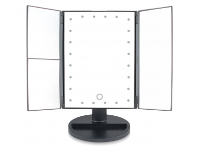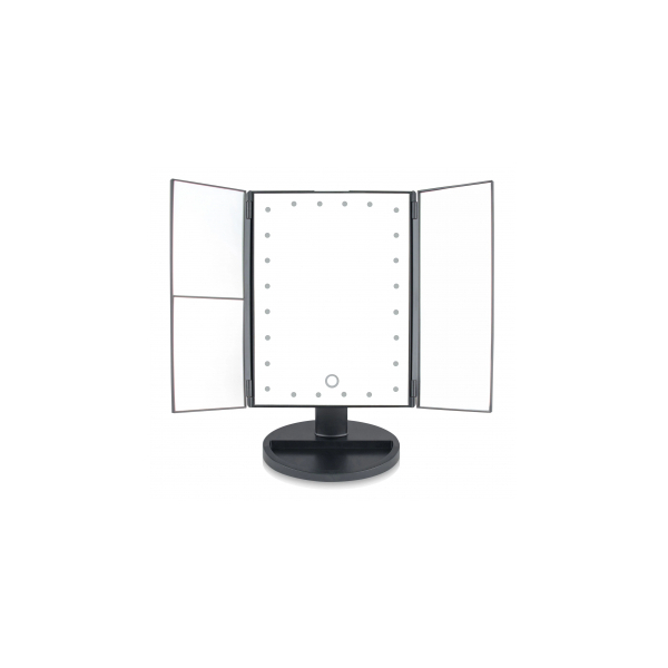 - Trīskāršā spoguļa dizains ļauj redzēt visas sejas puses, neturot rokās atsevišķu spoguli.