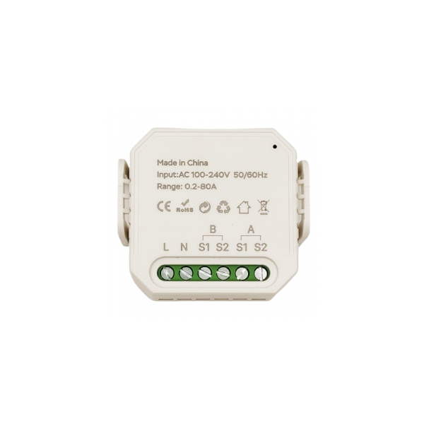 Technical specifications:Number of channels: 2.Measurement current: 0.2–80 A.Operating voltage: 100–240V AC.Frequency: 50/60 Hz.Energy measurement accuracy: ±2%.Wi-Fi frequency: 2.4 GHz.Wi-Fi standards: 802.11b/g/n.App: Tuya Smart / Smart Life (Android, iOS).Works with Amazon Alexa & Google Assistant.Reset button: yes.Indicator light: yes.Operating temperature: -10°C to +55°C.CT measurement aperture diameter: 10.5 mm.CT cable length: 0.7 m.Dimensions: 46 x 46 x 21.3 mm.