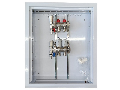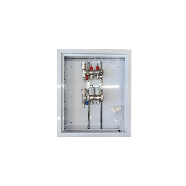 The set includes: Flush mounting metal box, 2 loops collector, flow meters and NC AC230V thermal actuators.