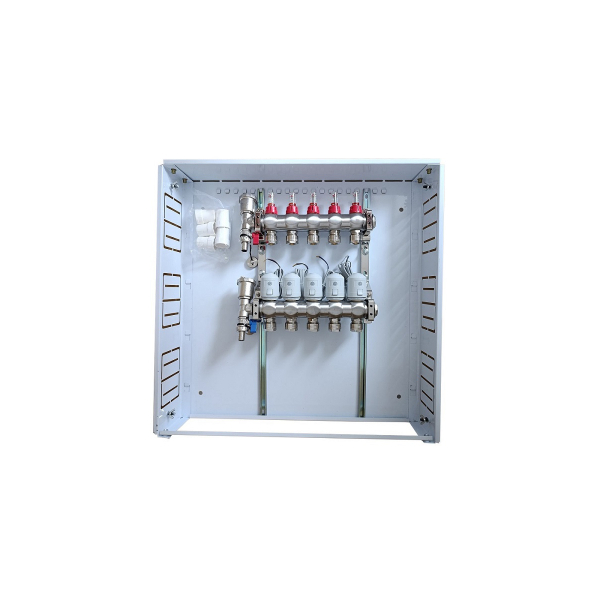 Underfloor heating manifold 5 loops with thermal actuators NC AC230V and flow metersThe set includes: Flush mounting metal box, 5 loops collector, flow meters and NC AC230V thermal actuators.