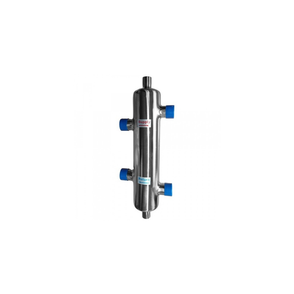 Features:This is a high-quality hydraulic water pressure distributor designed to separate the primary and secondary circuits in a heating system. It allows both circuits to operate independently, ensuring balanced flow distribution and efficient heat transfer. It also stabilizes water pressure and protects pumps and other components from malfunctions.The hydraulic separator is suitable for systems with a maximum flow rate of up to 2500 l/h (2.5 m³/h).The unit features four side connections (2x supply + 2x return) and two direct inlets/outlets from the top and bottom.Made of high-grade 304 stainless steel (compliant with 304 SS / AISI 304 standards), it offers long-lasting performance and corrosion resistance.The device has a robust and reliable construction with a wall thickness of 2 mm and a diameter of 76 mm.Supplied with black foam insulation, which provides both mechanical protection and thermal insulation by reducing condensation on the surface.Quick and easy installation – includes insulation clips and a screw kit for mounting.Ideal for underfloor heating systems with multiple pumps or circuits, or where stable operation across different heat sources (boilers, heat pumps, etc.) is required.Suitable for various heating and cooling systems in both residential and commercial applications.