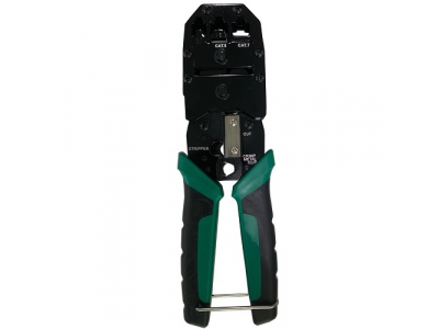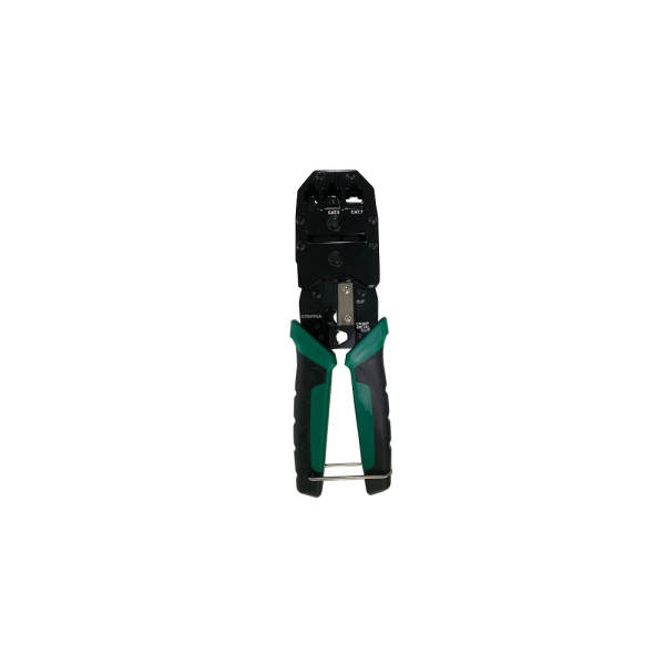 Specifications:Application: STP/UTP data cables CAT5, CAT5E, CAT6, CAT7, CAT8; 6-, and 8-position modular connectors (RJ11, RJ12, RJ45).Functions: cable stripping, cable cutting, 8P/6P contact crimping, swallowtail clip crimping, release/locking handle.Crimp nests: CAT7/8 (RJ45), CAT5/5E/6 (RJ45), 6P (RJ11/ RJ12).Material: PP steel, cold-rolled steel, SK5 cutting blades.Length: 210 mm.Weight: 386 g.Color: black, green.