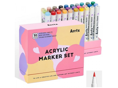 High-quality ARRTX waterproof acrylic paint marker pens set is designed for painting on different surfaces, such as paper, cardboard, glass, canvas, fabric, ceramics, plastic, wood, rock and more. The set includes 30 markers. The markers are safe, odorless, acid-free and water-based. This set is a good gift for everyone who loves DIY craft projects. You will no longer be bound by the material.