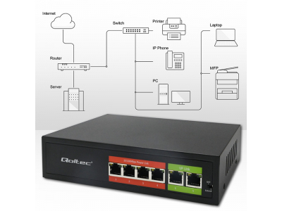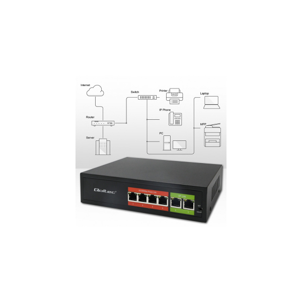 Qoltec ® Qoltec FAST Ethernet PoE SWITCH | 4x RJ45 PoE | 2x RJ45 Uplink | 65W | 10/100 Mb/s